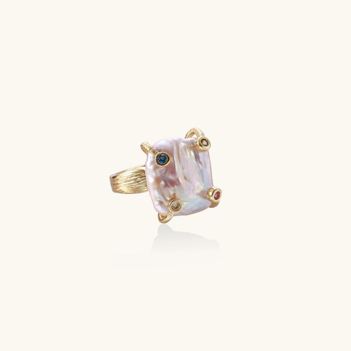 Baroque freshwater pearl—known for nurturing feminine energy—sits like a captured cloud between four gemstone compass points.