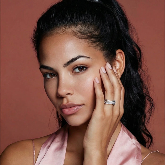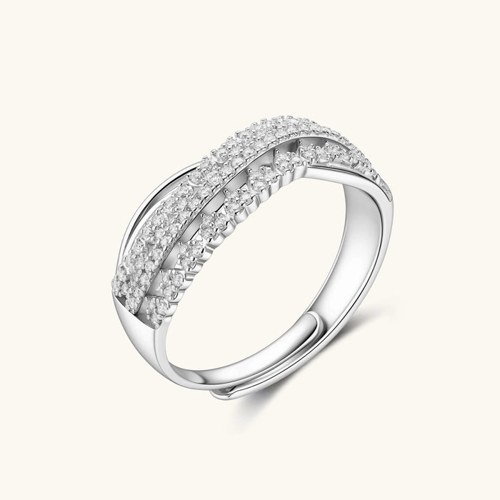 Moissanite stones—known for incredible brilliance—dance across intersecting sterling silver bands in this infinity-inspired design.
