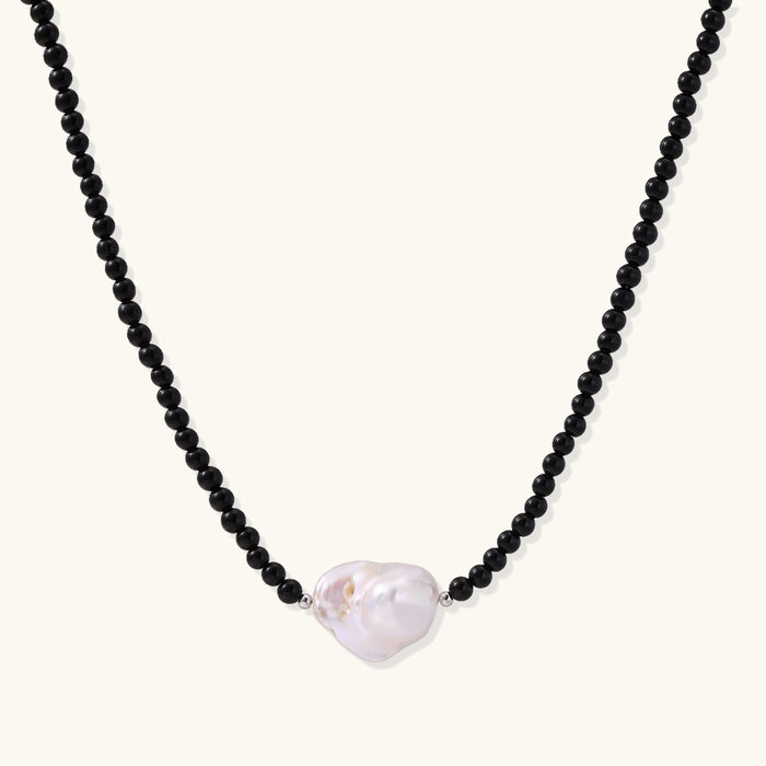 Glossy black agate grounds this luminous baroque pearl—known for nurturing feminine energy—in a study of contrasts.