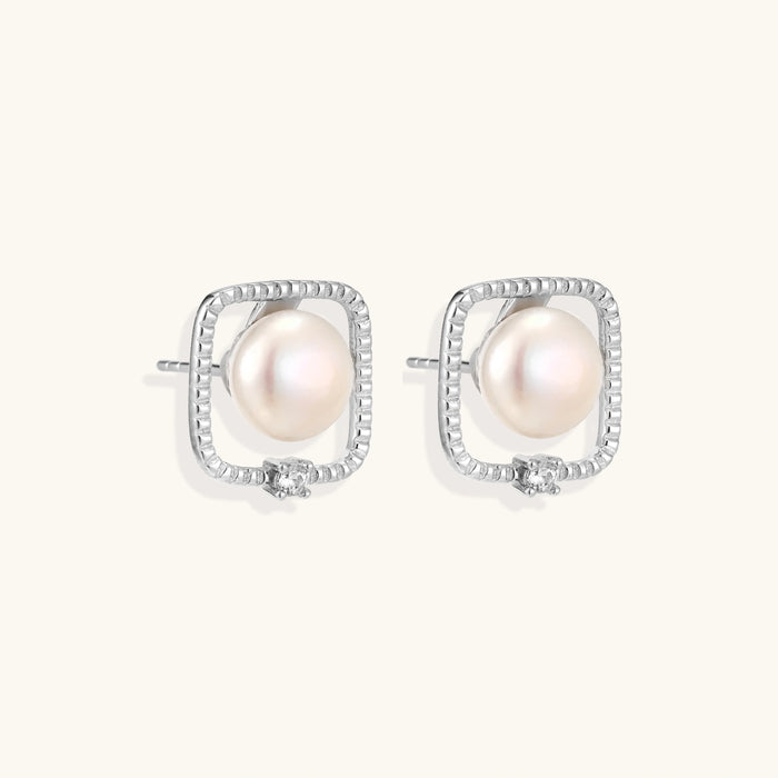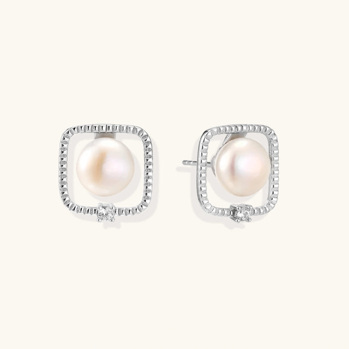 Architectural square frames meet glowing freshwater pearls—known for nurturing feminine energy—in these rhodium-plated sterling silver studs.