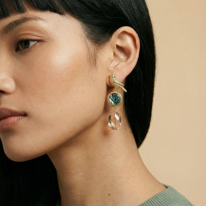 Intricately detailed songbirds perch above shimmering abalone shell—nature's own mood ring—paired with champagne crystal drops.